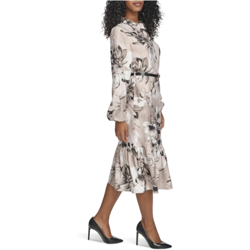 Calvin Klein Long Sleeve Dot Crepe Belted Bubble Hem Midi