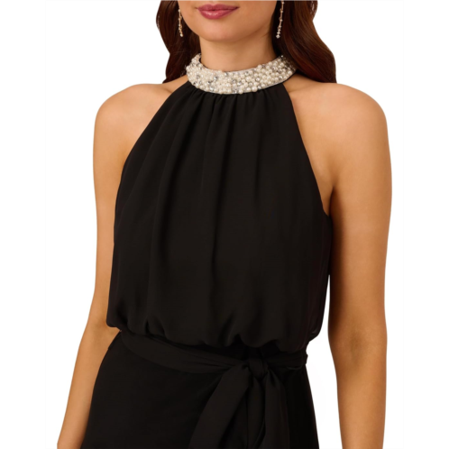 Adrianna Papell Stretch Chiffon Blousson Halter Cocktail Dress with Pearl Bead Necklace Detail