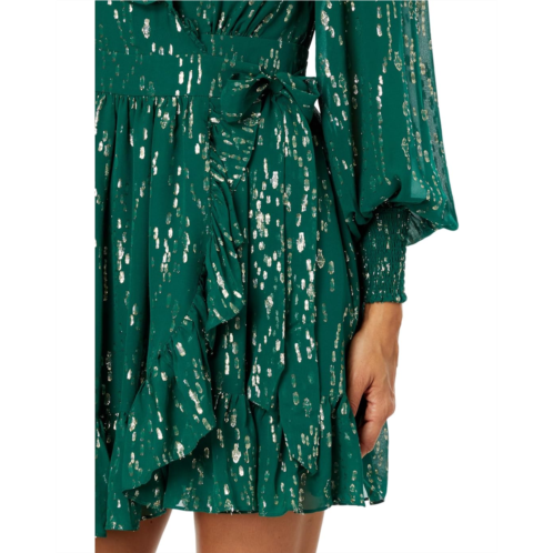 The Lilly Pulitzer Birdy Long Sleeve Silk Wr Dress showcases the ultimate expression of style and shimmer sophistication. It features a surplice neckline with ruffled trims and long puffed sleeves accompanying smocked cuffs.