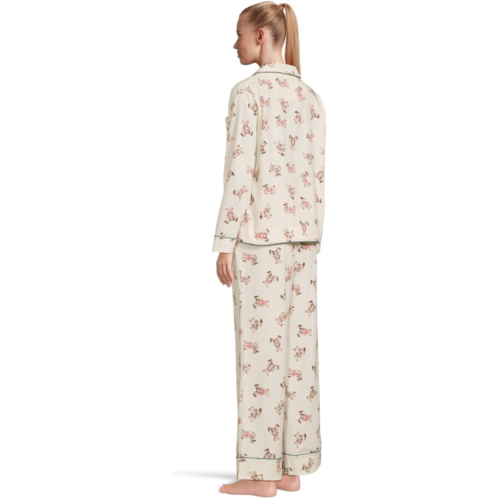 A notch collar button down long sleeve top with a front pocket paired with a drawstring wide-leg pant in a cozy, woven fabric with contrast piping. A must-have essential to your bedtime wear!