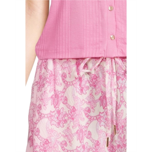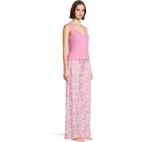 Experience staycation vibes styling Honeydew Intimates Coastal Cozy Tank Pant Set. Featuring a sleeveless, scoop neck tank with tank straps and a flirty snap-button front, this solid-colored top pairs seamlessly with flowy, patterned pajama pants that move with you. The pull-on pants come complete with a functional drawstring closure and belt loops, offering a custom fit with laid-back appeal.