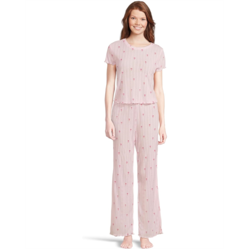 Chase golden hour vibes in the Honeydew Intimates Somewhere Sunny Tee Pant Set. This effortlessly cute set features a short sleeve tee with a classic crew neck and pull-on ease, elevated with delicate lettuce ruffles at the sleeves and hem for a flirty, feminine flair. Paired with straight-leg pants that mirror the same charming lettuce-edged detail, this set is crafted from soft, brushed pointelle fabric that feels like a gentle hug against your skin.