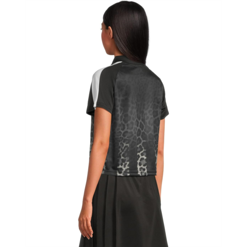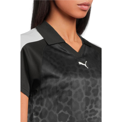 Elevate your style choosing the PUMA T7 Leo Luxe Relaxed Soccer Jersey, featuring sporty T7 panel inserts, a bold all-over animal print, and the iconic PUMA Cat Logo in rubber print on the chest. Perfect for adding a trendy and eye-catching flair to your outfit. It has a crew neckline, short sleeves, and a straight hem.