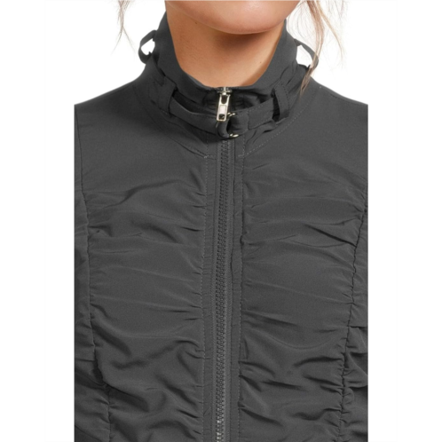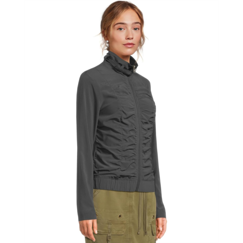 Maximum performance meets the XCVI Momentum Jacket in flexible Whisper four-way stretch fabric, designed for sweat-resistant movement and easy comfort. It features allover ruching on the front, an elastic cinched hemline, and a belted buckle detail at the collar for some added chic. The zippered front closure offers easy wear. This zip-up jacket is styled with long sleeves and a collared neckline. Activewear never looks so stylish, wear this jacket for movement or style with a casual bottom for sartorial excellence.