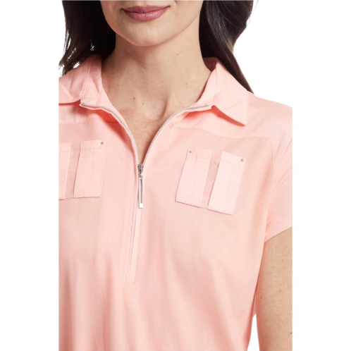 The flawless fit Jamie Sadock Solid Sunsense Polo with Mesh Overlay. This lightweight, fashionable top is made using performance, breathable fabric, classic fit, collared neckline with zippered placket, short sleeves, solid sun sense polo with mesh overlay, and pull-on style.