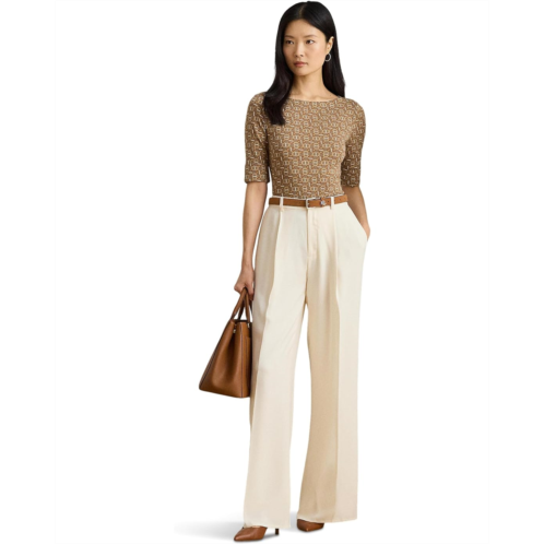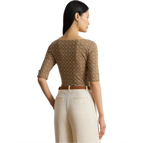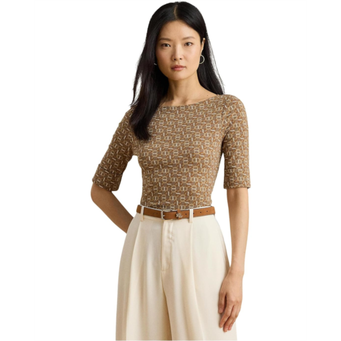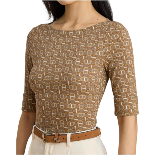 Made with soft, breathable stretch cotton, the Lauren Ralph Lauren Geo-Print Stretch Cotton Boatneck Tee highlights a stylized, equestrian-inspired geometric print. The pull-on style tee features a boat neck, elbow-length sleeves with folded cuffs, and a side-split hem. An 'LRL'-embroidered logo at the right hem adds a subtle signature finish.