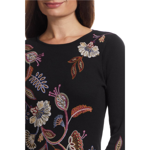 Chic and versatile, this Johnny Was Long Sleeve Thermal- Gineva top is adorned with beautifully embroidered florals in warm, earthy tones. The tailored silhouette balances comfort with sophistication, making it an easy choice for both casual outings and dressed-up evenings. It features a crew neckline, long sleeves, and a straight hem.