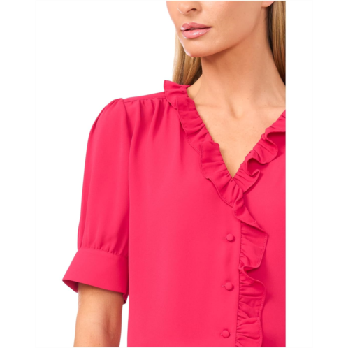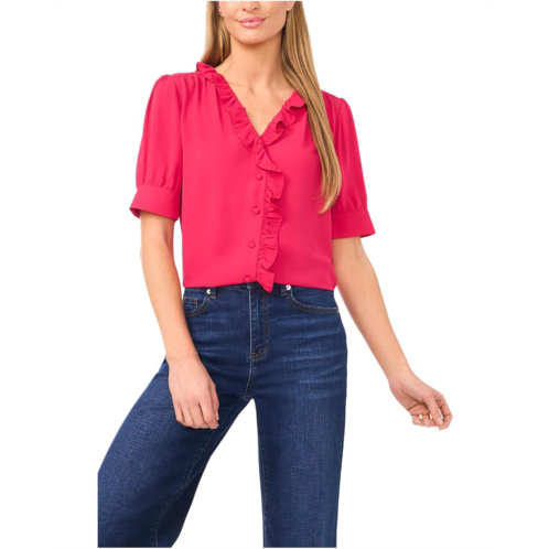 CeCe Short Puff Sleeve Button Down Ruffled Top
