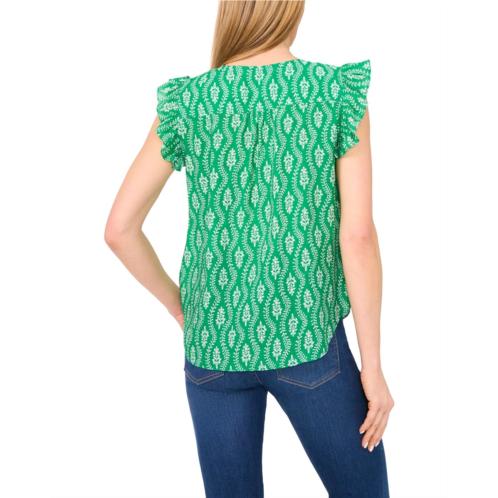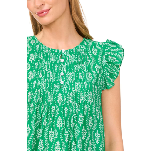 Look pretty and casual for the next gathering wearing the CeCe Drop Shoulder Kissing Placket Pintuck Top. The pull-on style top features a unique kissing half-front placket design, a crew neck, flutter cap sleeves, and an allover print, offering a relaxed yet stylish look with a hint of modern flair.
