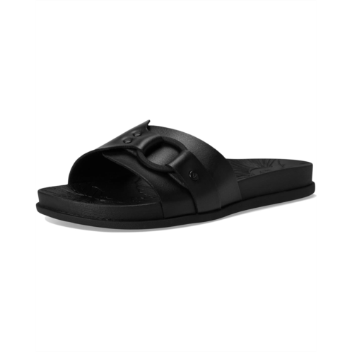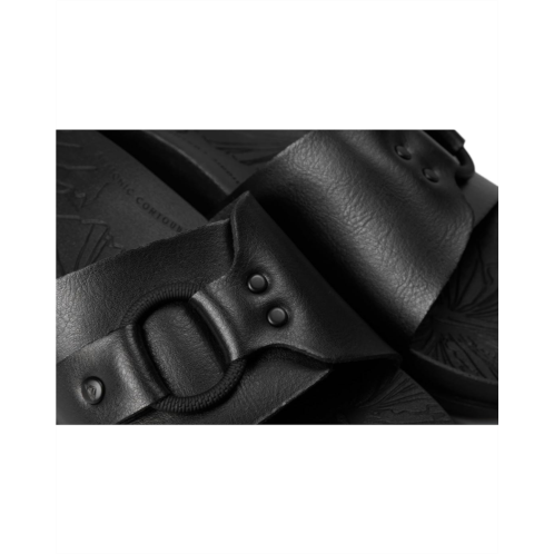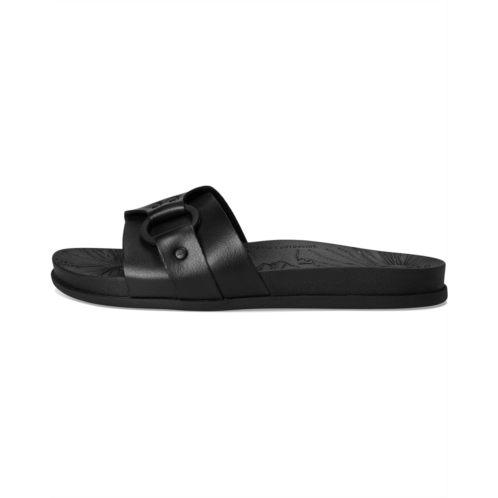 Chic, comfy, and ready to travel. An elevated take on a classic slide, the Reef Cushion Soho Cruz is perfect for dressing up or styling down on your next sunny outing. It's crafted with soft vegan leather, a rubber outsole, and generous arch support to keep you comfortable from vacation to city exploration. The Cushion Soho Cruz is ready for any adventure. Soft and supportive cushion with a rebound footbed with a hibiscus flower footbed design deboss. Super soft unlined PVC Free vegan leather slide with faux raffia molded buckle and recycled hardware detail.