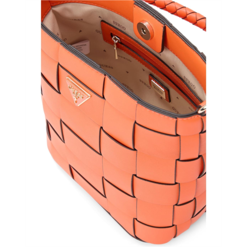 Turn heads carrying the GUESS Maylee Bucket, where trendsetting vibes meet everyday versatility. Crafted from durable polyester with a sleek, structured silhouette, this bag is made for fashion-forward go-getters. The magnetic snap closure ensures easy access while keeping your essentials secure, whether you're running errands or heading out for brunch. Inside, stay organized with a back wall zippered compartment and three convenient front wall card slots; no wallet, no problem! Designed for flexibility, the Maylee comes with both shoulder and crossbody straps, giving you effortless options to suit your mood and moment. Stylish, compact, and smartly designed, the Maylee Bucket is your go-to companion for taking on the day with confidence and flair.