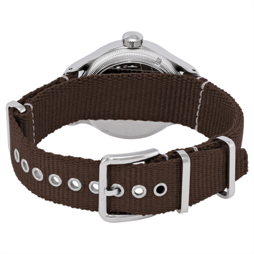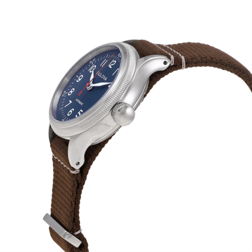 Stainless steel case with a brown nylon NATO strap. Fixed stainless steel bezel. Blue dial with white hands and Arabic numeral hour markers. Minute markers. Arabic numeral minute markers (at 10 minute intervals) around the outer rim. Dial Type: Analog. Luminescent hands. Caliber Miyota 8250 automatic movement with a 42 power reserve. Scratch resistant mineral crystal. Pull / push crown. Solid case back. Round case shape. Case size: 37 mm. Case thickness: 14 mm. Band width: 18 mm. Tang clasp. Water resistant at 30 meters / 100 feet. Functions: hour, minute, second. Casual watch style. Bulova Automatic Blue Dial Watch 96A282.