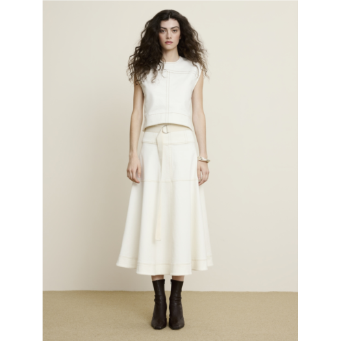 - An exploration of luxe utility,we added a removable belt at the waist, decorative top stitching, and an extra wide hem to emphasize the A-line shape of this long skirt. Cut from rugged, yet soft stretch-cotton denim and specially washed for already-loved softness.