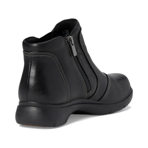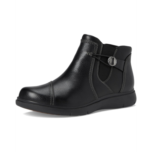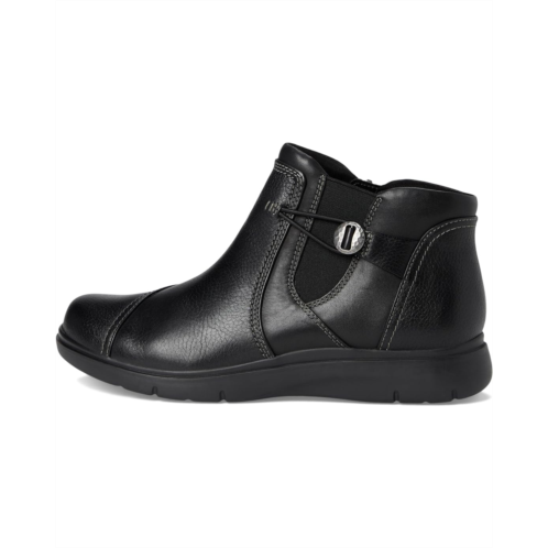 An elasticized gore panel and side zipper for easy entry accentuate the Clarks Certina Joy Ankle Boot. Featuring a roomy round toe shape, the footwear has leather upper, lining, and suede insole.