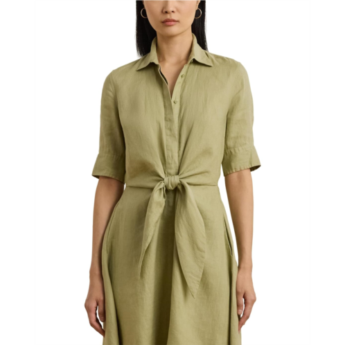 Light as air linen brings a breezy look and feel to this iteration of Lauren Ralph Lauren Petite Wakana Elbow Sleeve Day Dress, while a charming self tie waist adds to its easy character. Featuring fit and flare silhouette, point collar neckline, concealed buttoned placket, and three-quarter length sleeves.