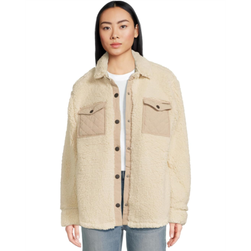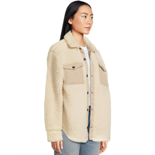 The Salty Crew Calm Seas Shacket is a fully lined plush sherpa jacket with a snap-front closure, hooded pockets, and metal branding at the chest pocket. It has a collared neckline, long sleeves, two button-flap chest pockets, and a curved hem.