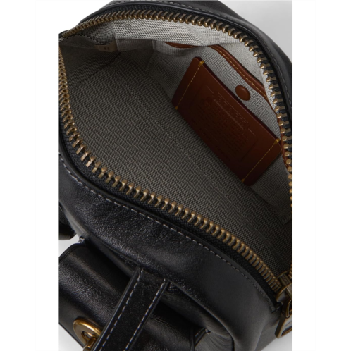 The COACH Twin Turnlock Bag 20 is a hand-carry bag with four protective feet at the base for convenient carrying. Made from waxed smooth leather, this luggage bag is designed with dual grab handles and a zippered top closure. With its two outside turnlock pockets, an interior compartment, and an inside snap pocket, this leather bag offers enough space for all your essentials.