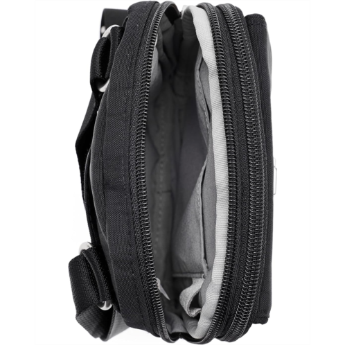 - RFID-protected card slots, two interior zippered compartments, and key leash.