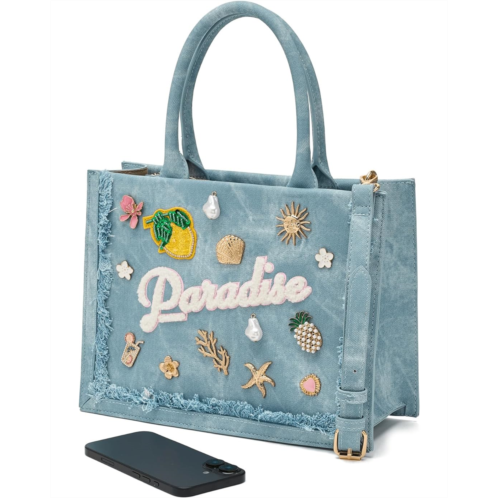 - Carry your casual style and look classy carrying the ALDO Paradisetotee. This denim tote bag is perfect for travel, with its sturdy material and playful embellishments. Crafted from polyurethane upper, this bag features zippered closure, two shoulder straps, detachable and adjustable crossbody straps, one interior main compartment, and one slip pocket.
