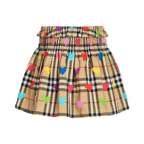 버버리 - The Burberry Kids Ama Check Heart Skirt is perfect for day outs or picnics with your little one. The pull-on style skirt features an elasticated mid-rise waist with ruffled details, an allover checkered print, allover multicolored heart detailing, and an above-the-knee length.