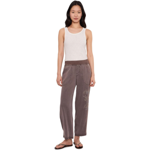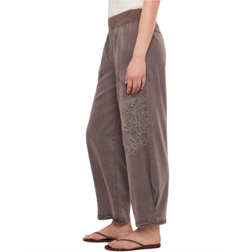 - Structured enough for the office yet relaxed enough for weekends, these XCVI Embroidered Carrel pants pair seamlessly with blouses, tees, or blazers. It features elasticized waistband, side hand pockets, cropped length, faux fly detailing, and embroidered detailing on the left leg.