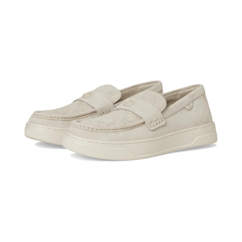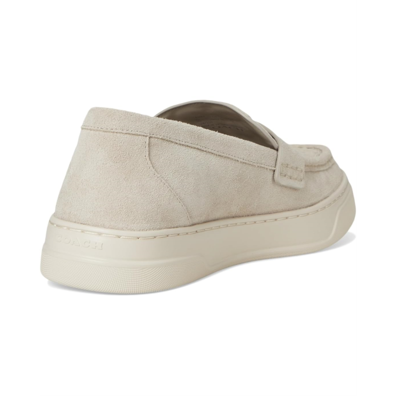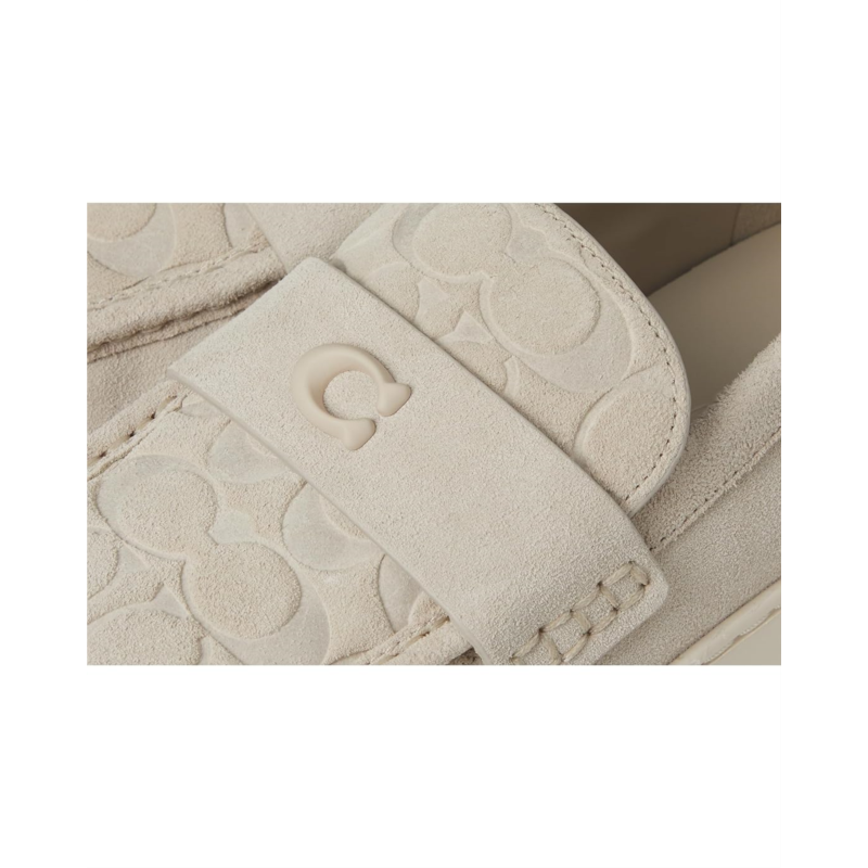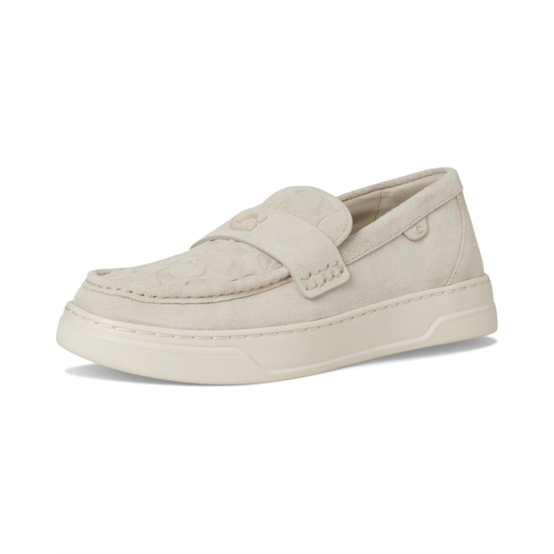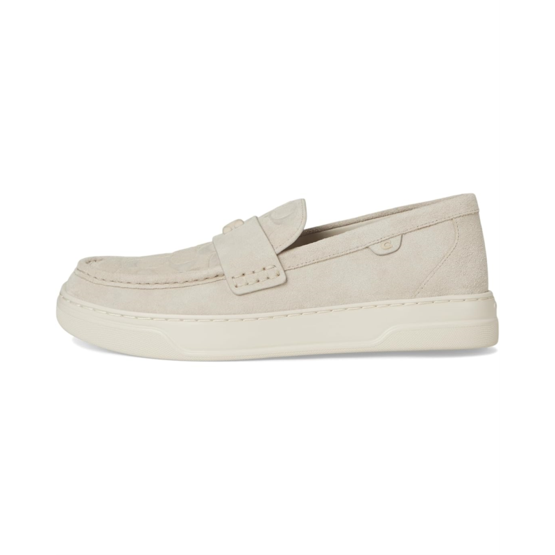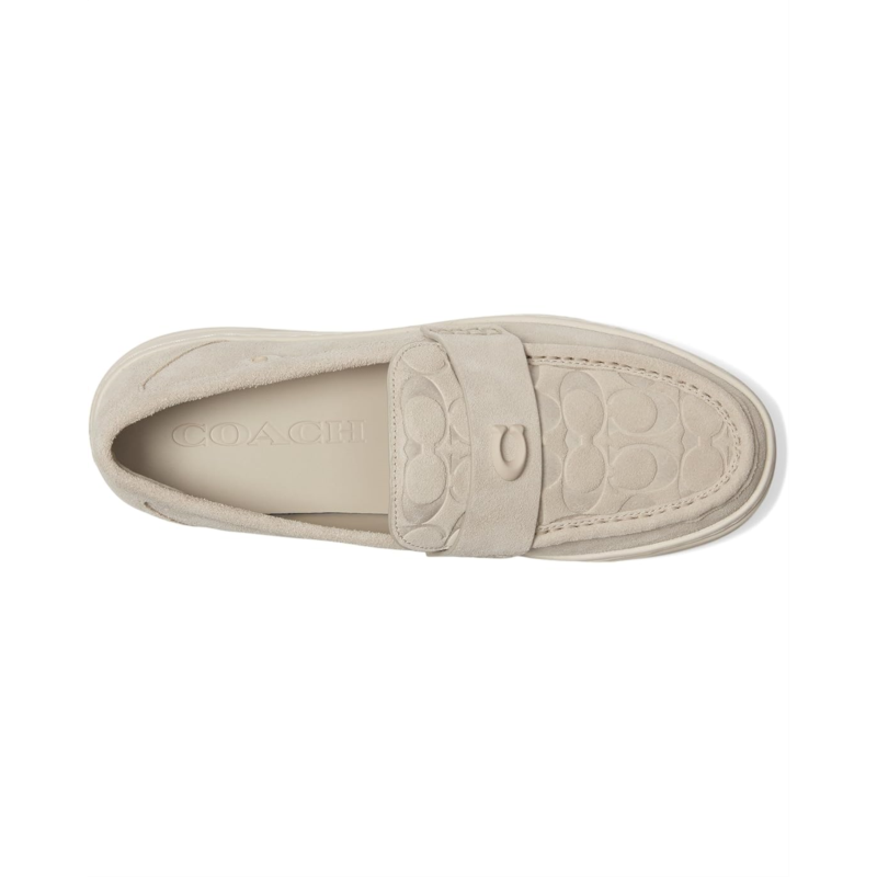 Walk with pride wearing the COACH Hybrid Loafer With Signature. Crafted from suede upper, man-made leather lining, and EVA insole, this pair of shoes features round toe, slip-on style, decorative strap with logo hardware at vamp, embossed logo pattern at vamp, and brand detailing on the footbed.