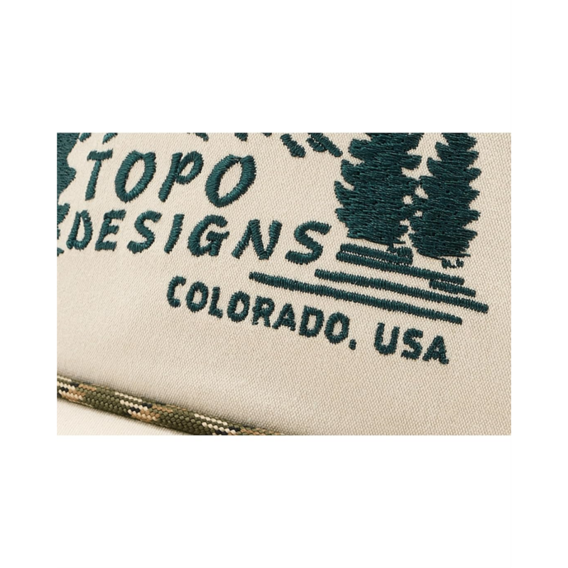 - The Topo Designs Twill Rope Cap - Mountain Scene features a rope detail across the brim for a classic heritage touch. The standout element is the embroidered mountain scene graphic, celebrating nature and exploration. Designed with a structured crown and adjustable snapback closure, this cap offers a comfortable fit.