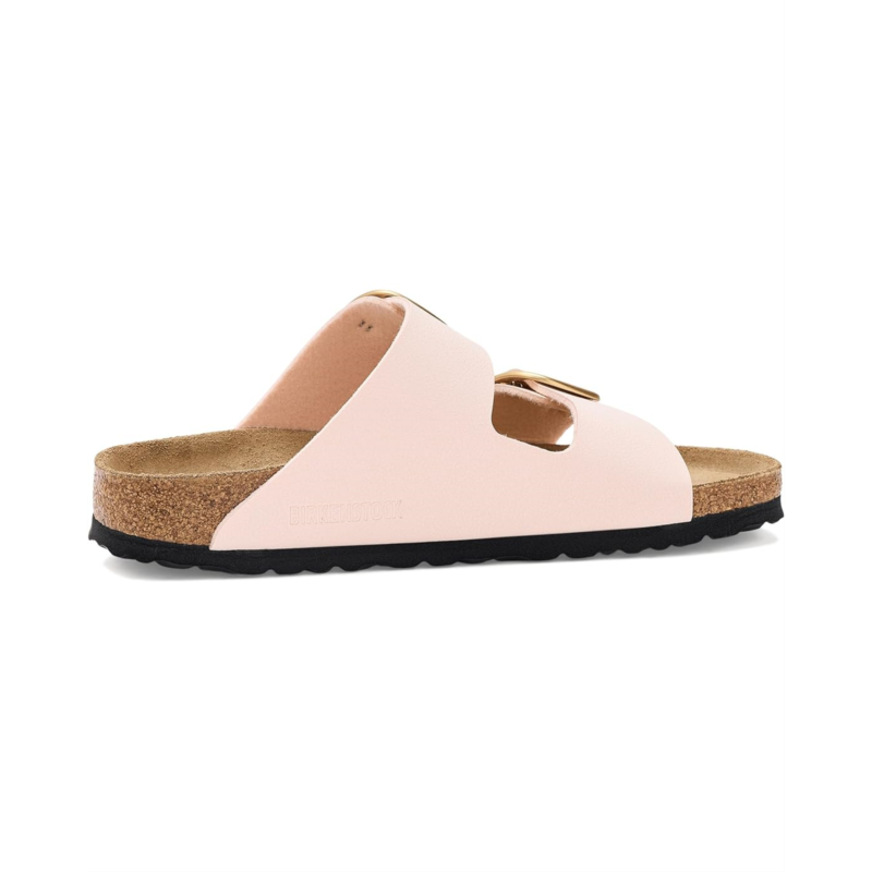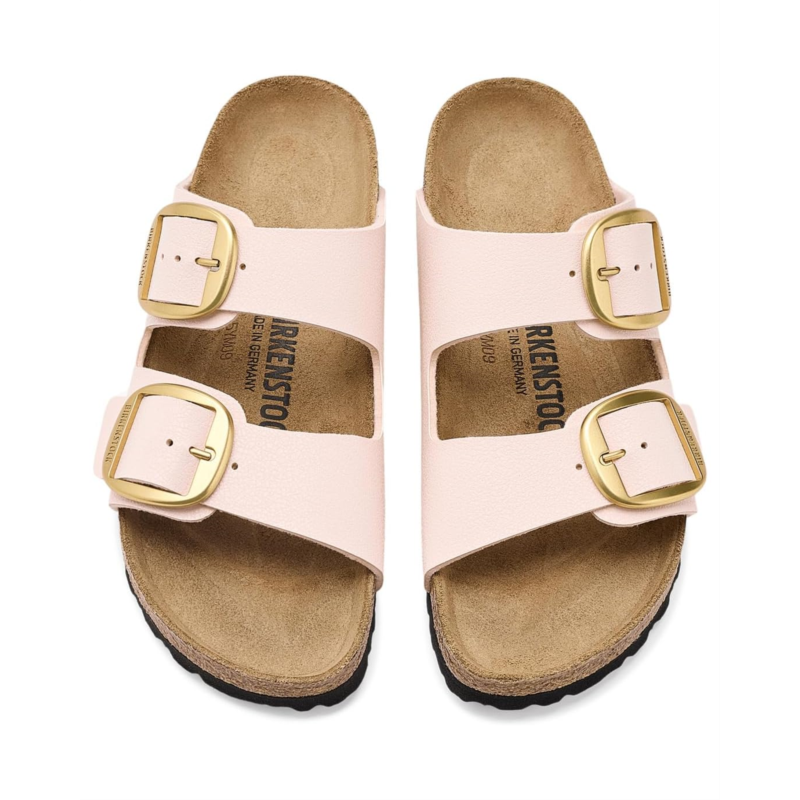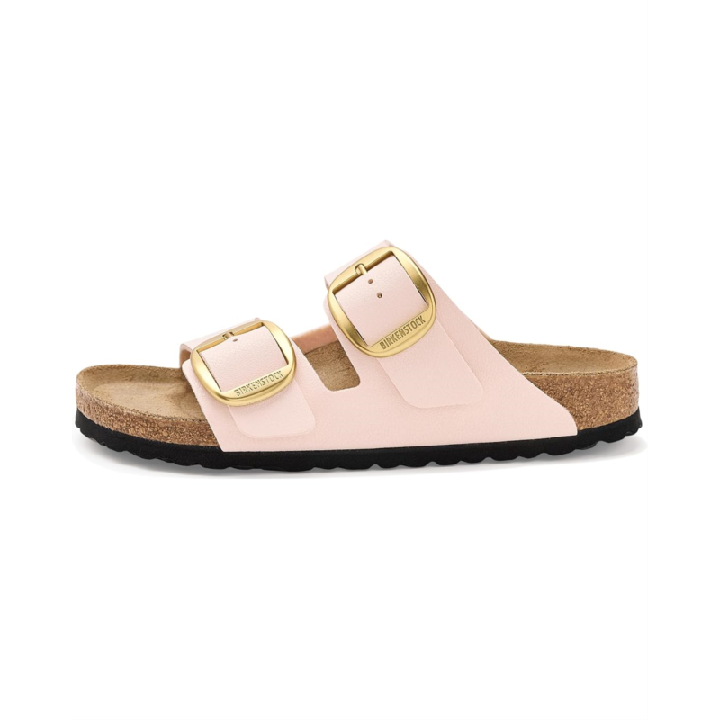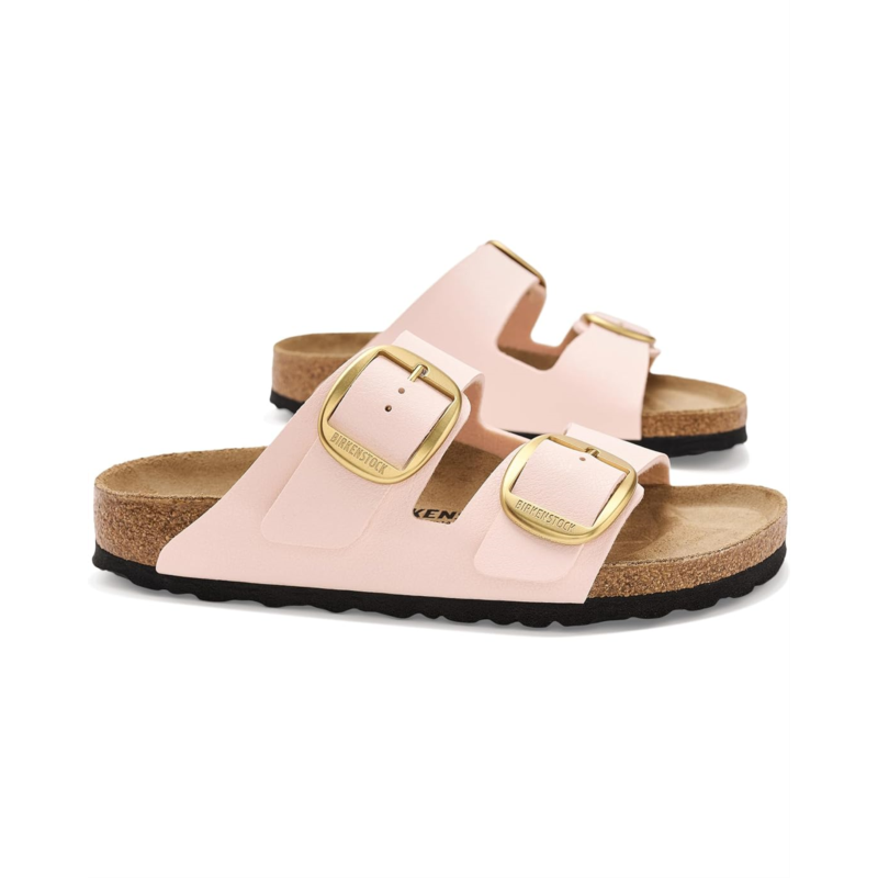 - The Birkenstock Arizona Big Buckle - Birki brings a bold twist to the brands iconic two-strap sandal. The Birko-Flor upper, made of acrylic and polyamide felt fibers with a smooth leather-like finish, is durable yet soft against the skin. Its contoured cork-latex footbed molds to your foot over time, supported by a raised toe bar that encourages natural gripping motion and aids circulation. A neutral heel profile and deep heel cup help distribute weight evenly, while the dual-layer jute top wicks away moisture and adds strength for easy resoling. Finished with a flexible ethylene vinyl acetate outsole that provides lightweight, shock-absorbing support, this sandal combines Birkenstocks legendary comfort with a fashion-forward big buckle design for a fun summer look.