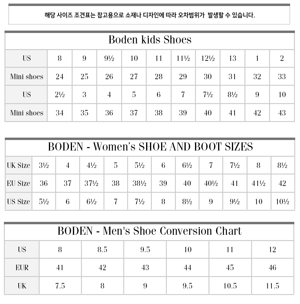 • 사이즈 조견표는 고객님의 이해를 돕기 위한 참고용이며 실제 제품과 사이즈 조견표상의 차이로 인한 반품(무상) 및 교환은 불가합니다.