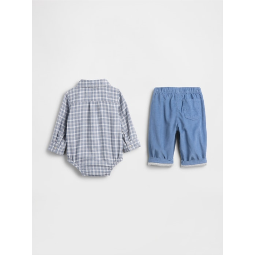- Soft cotton flannel shirt bodysuit and pull-on corduroy pants outfit set.