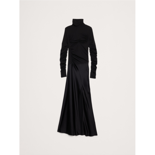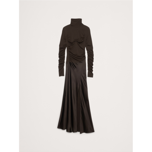 - This maxi dress is all about the details: the high neck, the ruched bodice and bust, and the extra-long sleeves with vented cuffs. Plus, we cut it from a mix of soft jersey for a sleek and form-fitting bodice, and deliciously luxe stretch-satin for the skirt.
