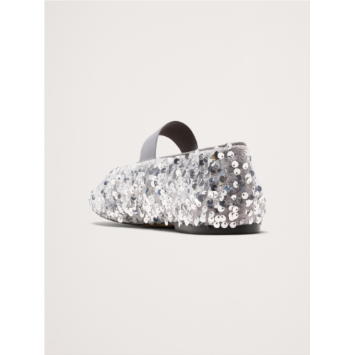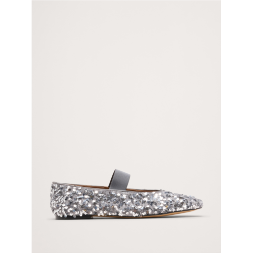 - A festive, Mary Jane flat covered in sparkling silver sequins.