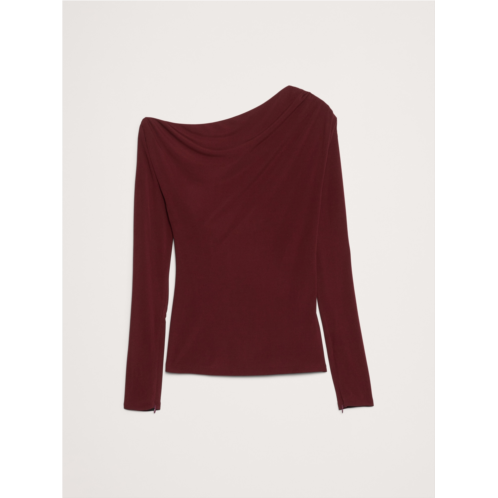 - We cut this asymmetrical top from a stretch-crepe fabric we love for its sophisticated look and softness. Here, in a long-sleeve top with a twisted detail at back that creates a one-shoulder look.