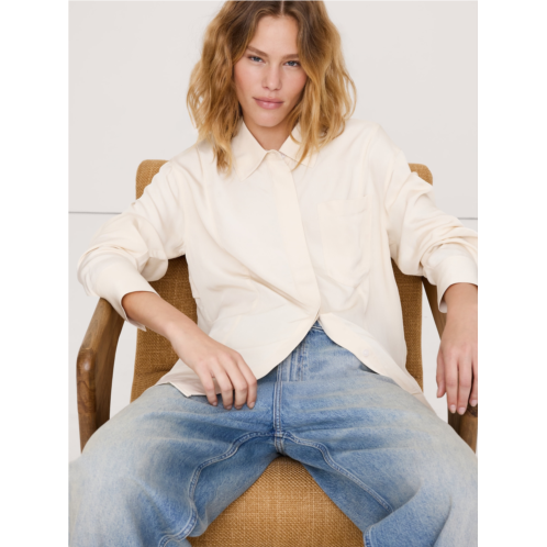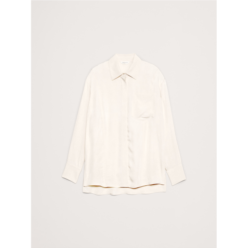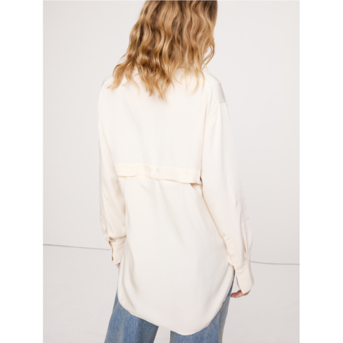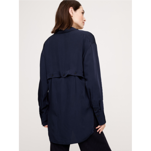 - A fresh take on the classic button-down, we cut this tunic with a button placket across the back shoulders so you can wear it closed or open for a peek-a-boo effect. Crafted in a drapey shirting fabric we love for its beautiful drape and softness.