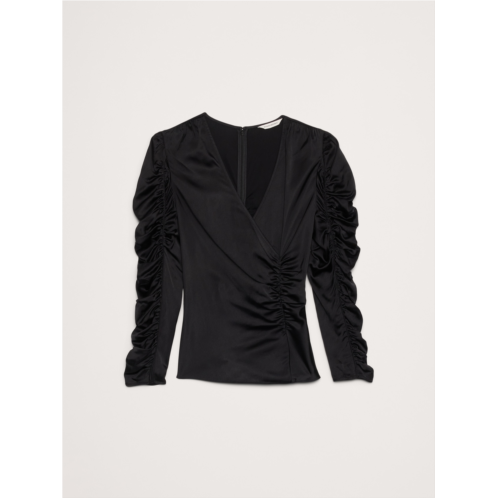 - Going somewhere? This stretch-satin top is all about the details: a v-neck, flattering ruched bodice, and ruched sleeves.