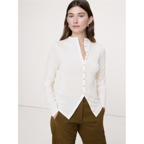 - This button-front top is made from a luxuriously soft wool-blend jersey, in a weight that's suitable for layering through cooler weather.