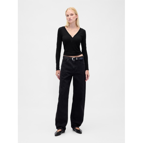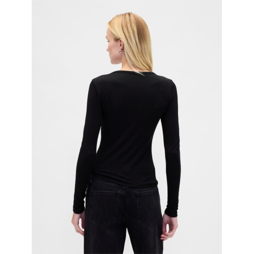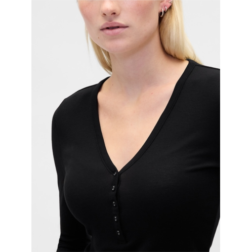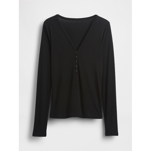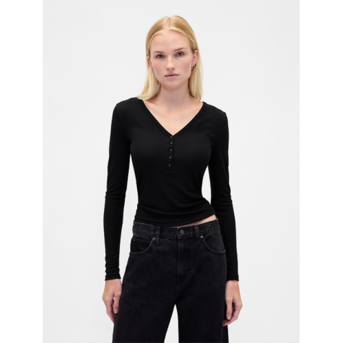 - Soft, sheer, ribbed stretch knit Henley T-shirt. In a slightly cropped length.