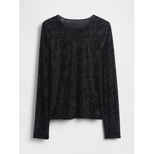 - Soft sheer top with burnout velvet detailing. In a slightly cropped fit.