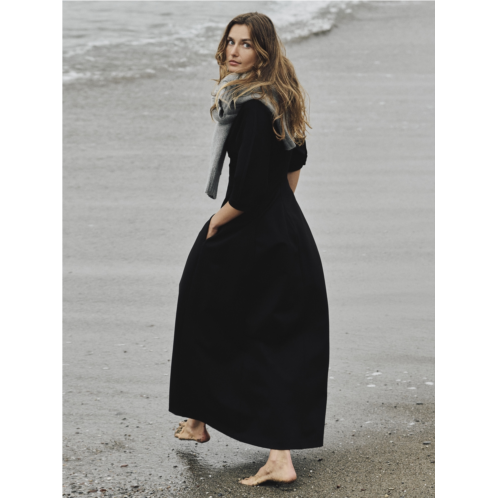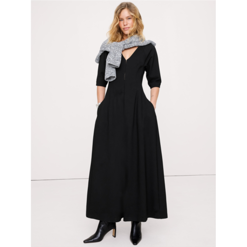 - We designed this tailored maxi dress with darts at the waist and hook-and-eye closure at the front for a corset-inspired look. This one is made in one of our favorite ponte knits (so it's super soft).