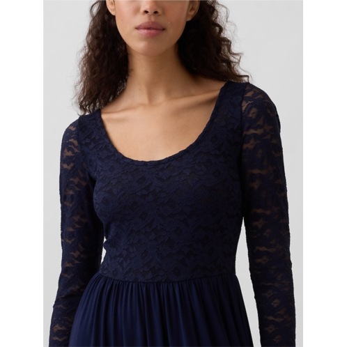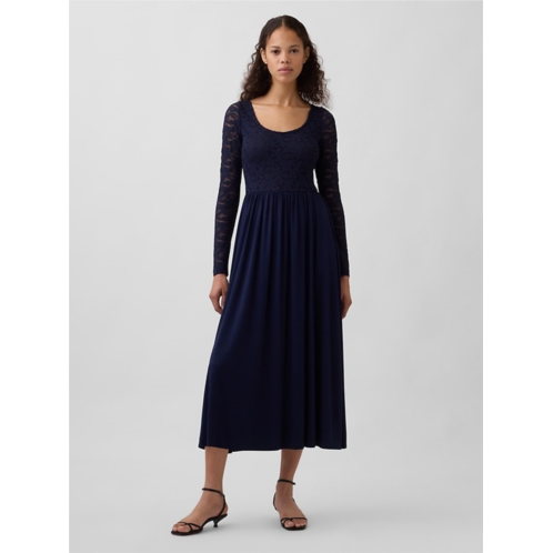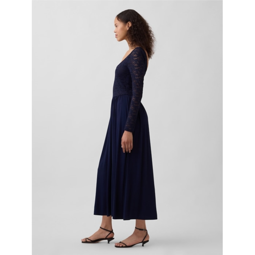 - Soft floral lace top with a stretch jersey skirt in a mixed media maxi dress.