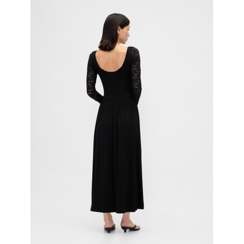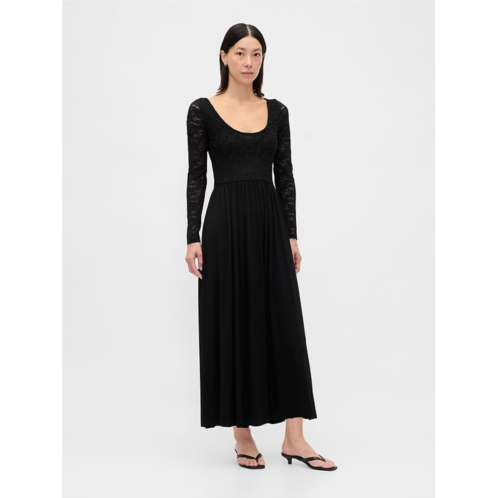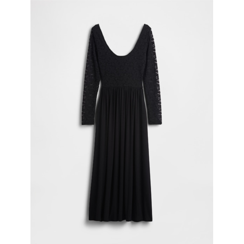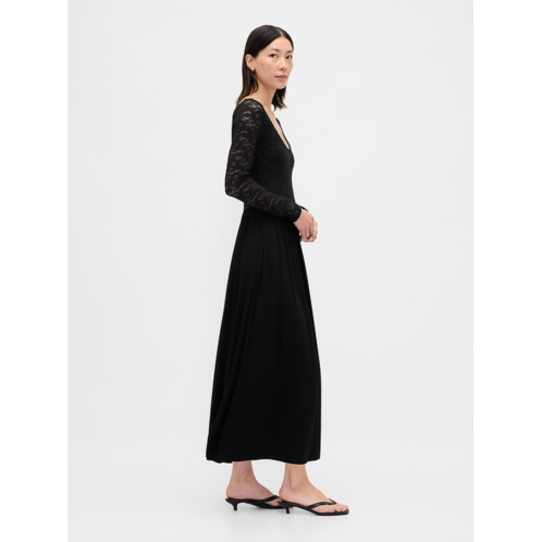 - Soft floral lace top with a stretch jersey skirt in a mixed media maxi dress.