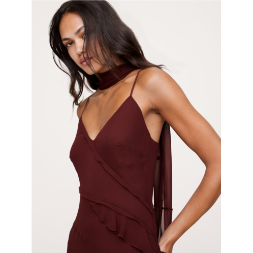 - Going somewhere? Wear this. We cut this ruffled maxi dress from a soft, light-as-chiffon georgette, opting for a wraparound construction technique to show off your shape. Plus, it comes with a long, skinny scarf to toss across your shoulders, wrap around your neck, or tie in your hair.