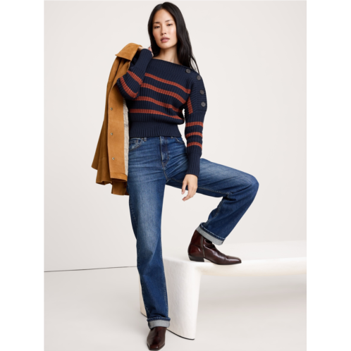 - We love a boatneck sweater. Here, we borrowed the button-shoulder detail from a vintage sweater, and recreated it in one of our favorite organic cotton yarnsone we love for its softness and all-season weight.