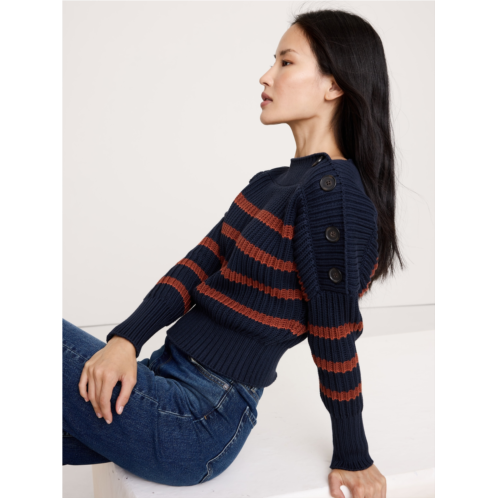 - We love a boatneck sweater. Here, we borrowed the button-shoulder detail from a vintage sweater, and recreated it in one of our favorite organic cotton yarnsone we love for its softness and all-season weight.