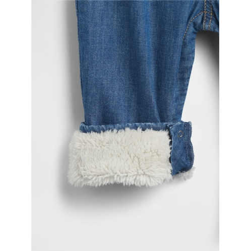 - Soft cotton denim baby overalls with a cozy microfleece lining.