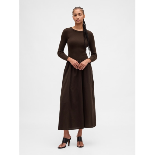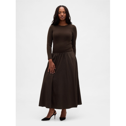 - Soft, ribbed sweater knit cotton top and smooth sateen skirt mixed media maxi dress.