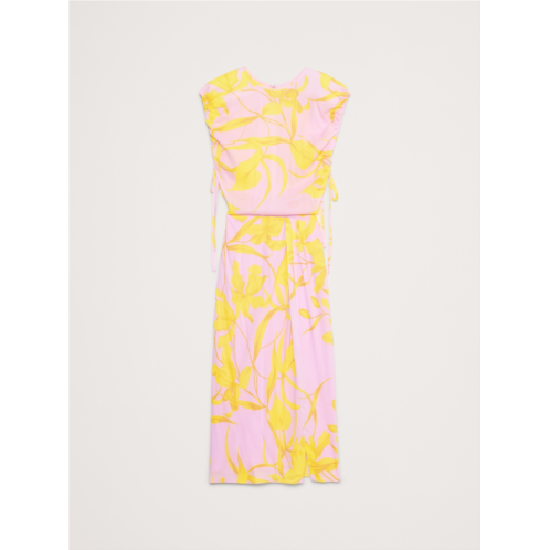 - A modern silhouette with artful ruching, ties at the sleeves, and an open back. Another thing we love? It’s cut from a viscose crepe that feels light-as-chiffon with a subtle stretch.
