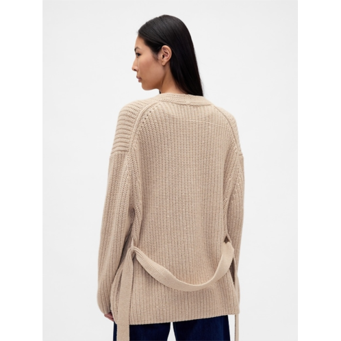 - Soft knit belted wrap cardigan sweater. In an oversized fit.