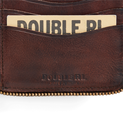 * Zip-around closure with a leather zipper pull.