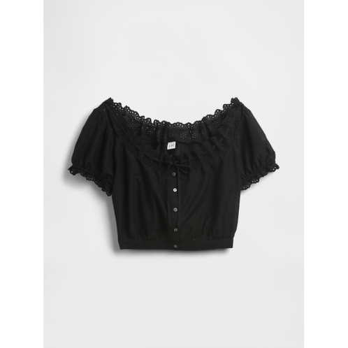 - Eyelet lace trim at neck and sleeves.